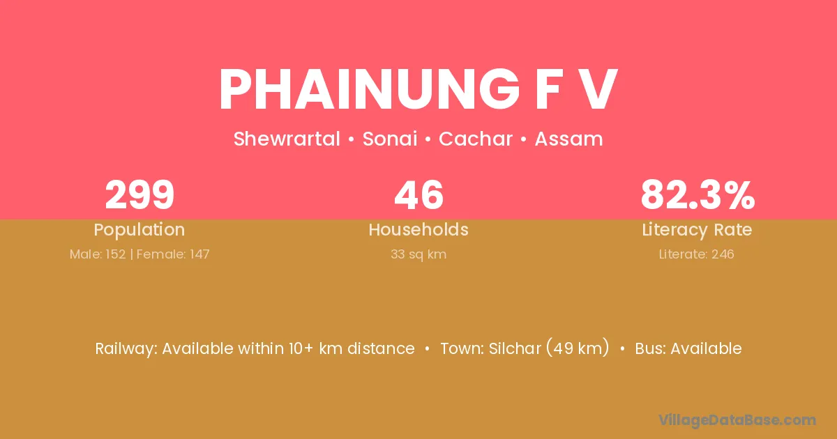 Silchar (49 km) is the nearest town to Phainung F V village for major economic activities and is located approximately 49 km away.