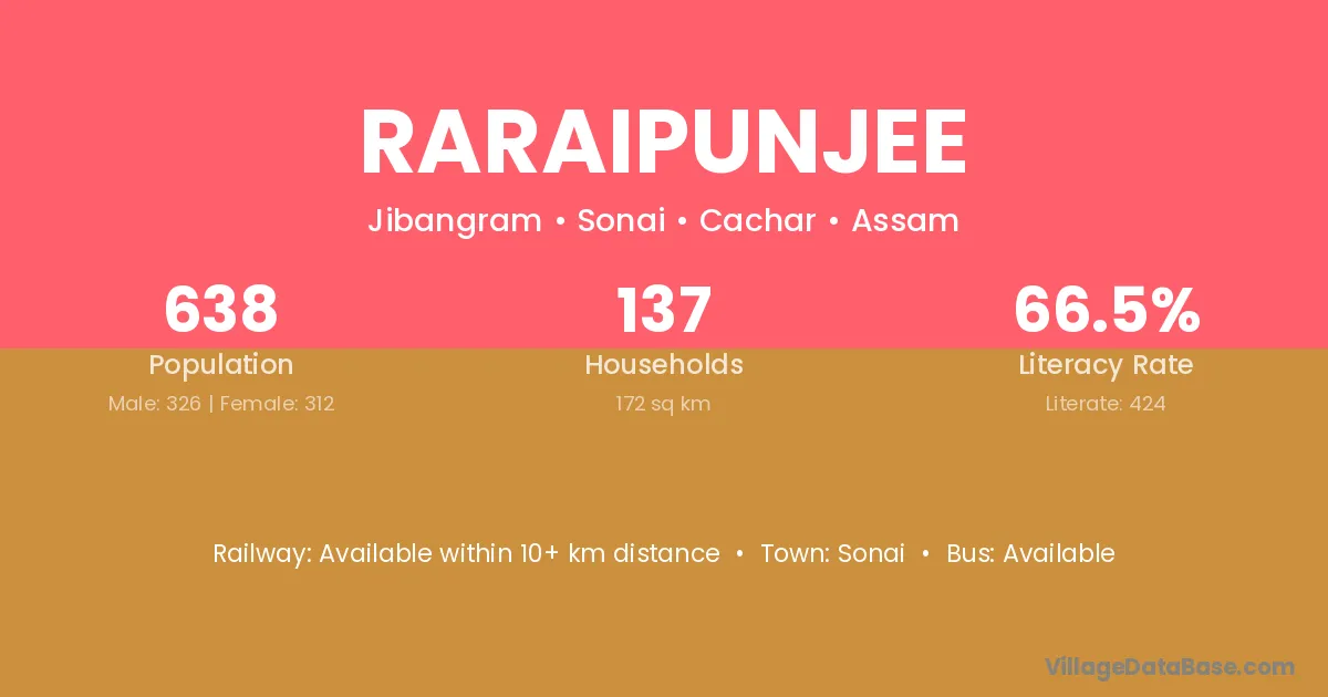 Raraipunjee village has a total population of 638 people, of which 326 are males and 312 are females.