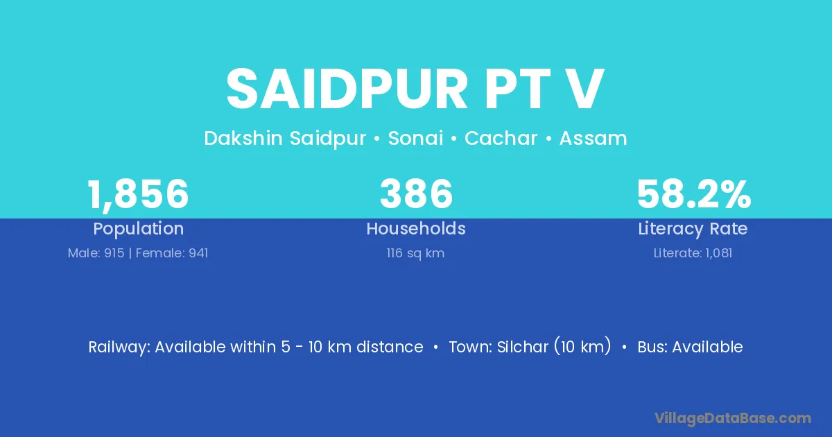 Silchar (10 km) is the nearest town to Saidpur Pt V village for major economic activities and is located approximately 10 km away.