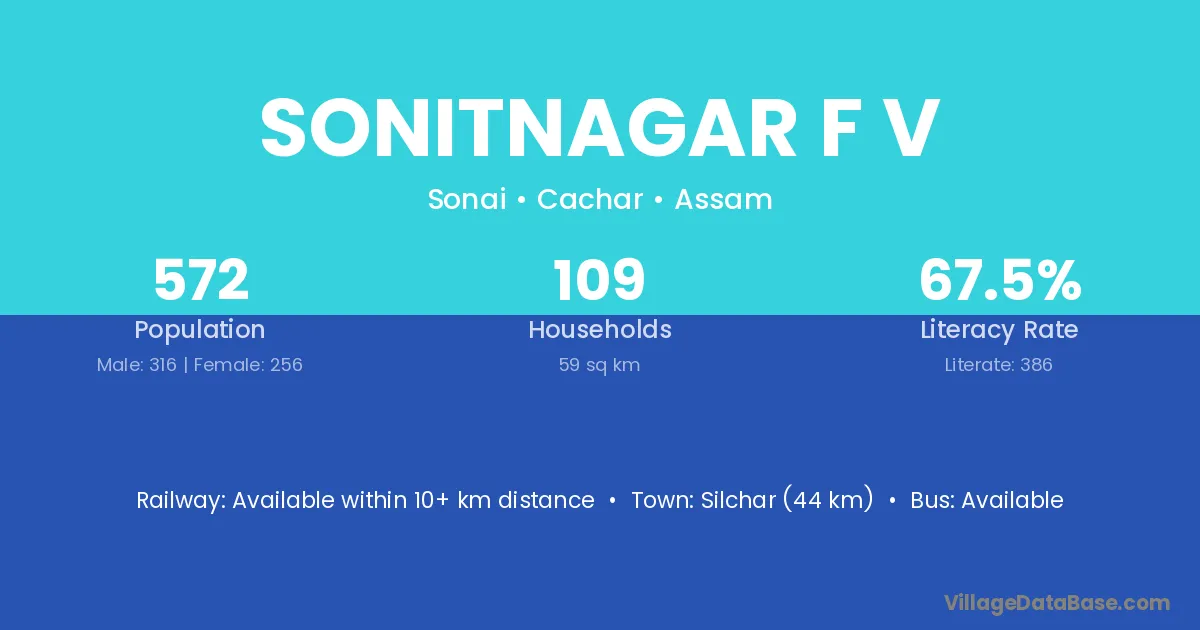 Silchar (44 km) is the nearest town to Sonitnagar F V village for major economic activities and is located approximately 44 km away.