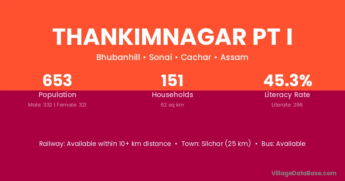 Silchar (25 km) is the nearest town to Thankimnagar Pt I village for major economic activities and is located approximately 25 km away.