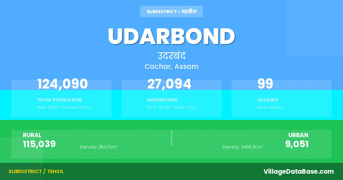 According to the 2011 census The total area of Udarbond Subdivision is 445 km², with a population of 124090 people. The population density is 279 inhabitants per square kilometre, and there are approximately 27094 houses in the sub district.