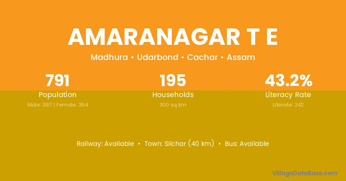 Silchar (40 km) is the nearest town to Amaranagar T E village for major economic activities and is located approximately 40 km away.