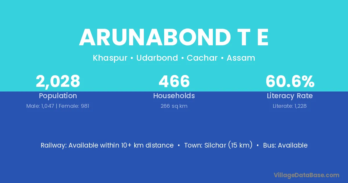 Silchar (15 km) is the nearest town to Arunabond T E village for major economic activities and is located approximately 15 km away.