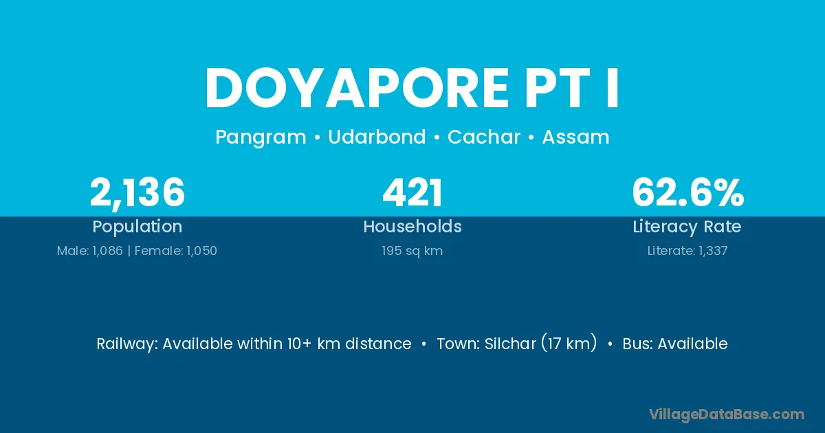 Silchar (17 km) is the nearest town to Doyapore Pt I village for major economic activities and is located approximately 17 km away.