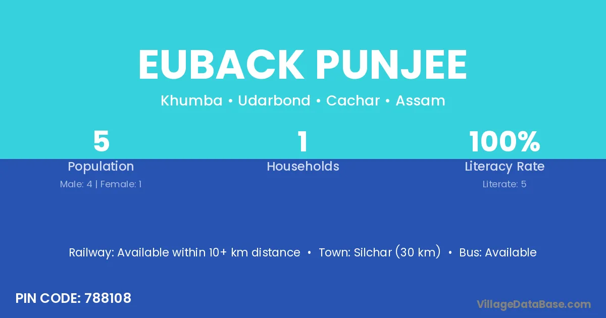 Silchar (30 km) is the nearest town to Euback Punjee village for major economic activities and is located approximately 30 km away.