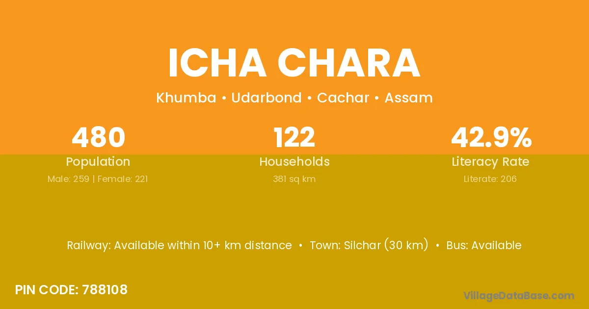 Silchar (30 km) is the nearest town to Icha Chara village for major economic activities and is located approximately 30 km away.
