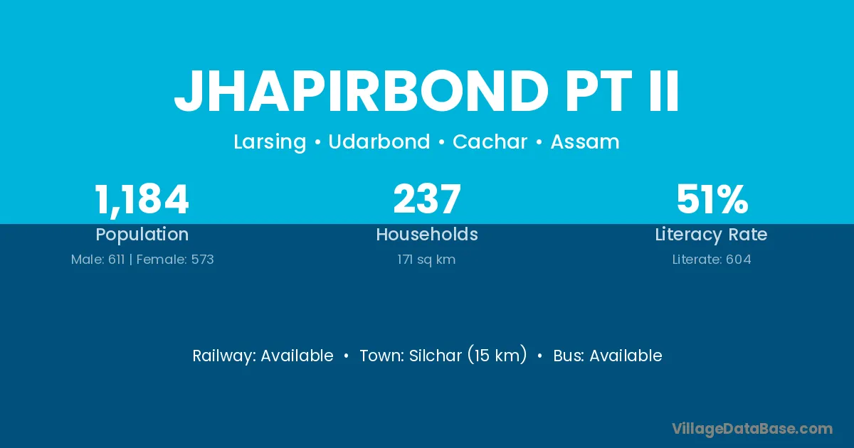 Silchar (15 km) is the nearest town to Jhapirbond Pt Ii village for major economic activities and is located approximately 15 km away.