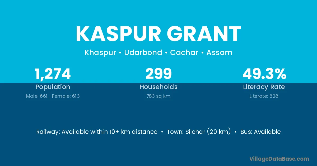 Silchar (20 km) is the nearest town to Kaspur Grant village for major economic activities and is located approximately 20 km away.