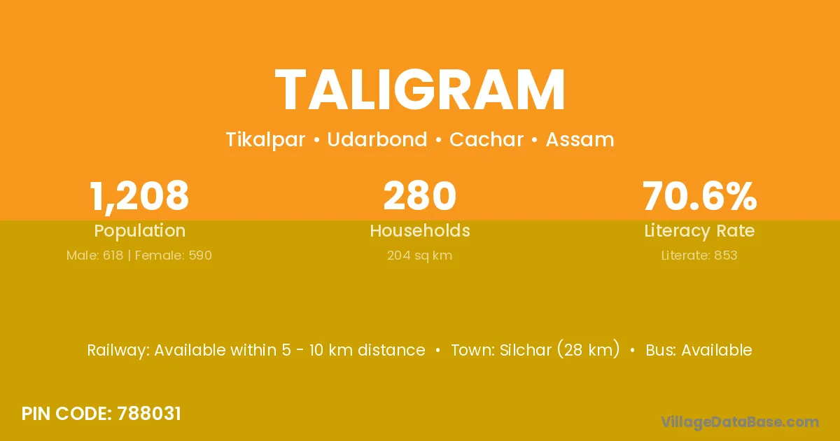 Silchar (28 km) is the nearest town to Taligram village for major economic activities and is located approximately 28 km away.