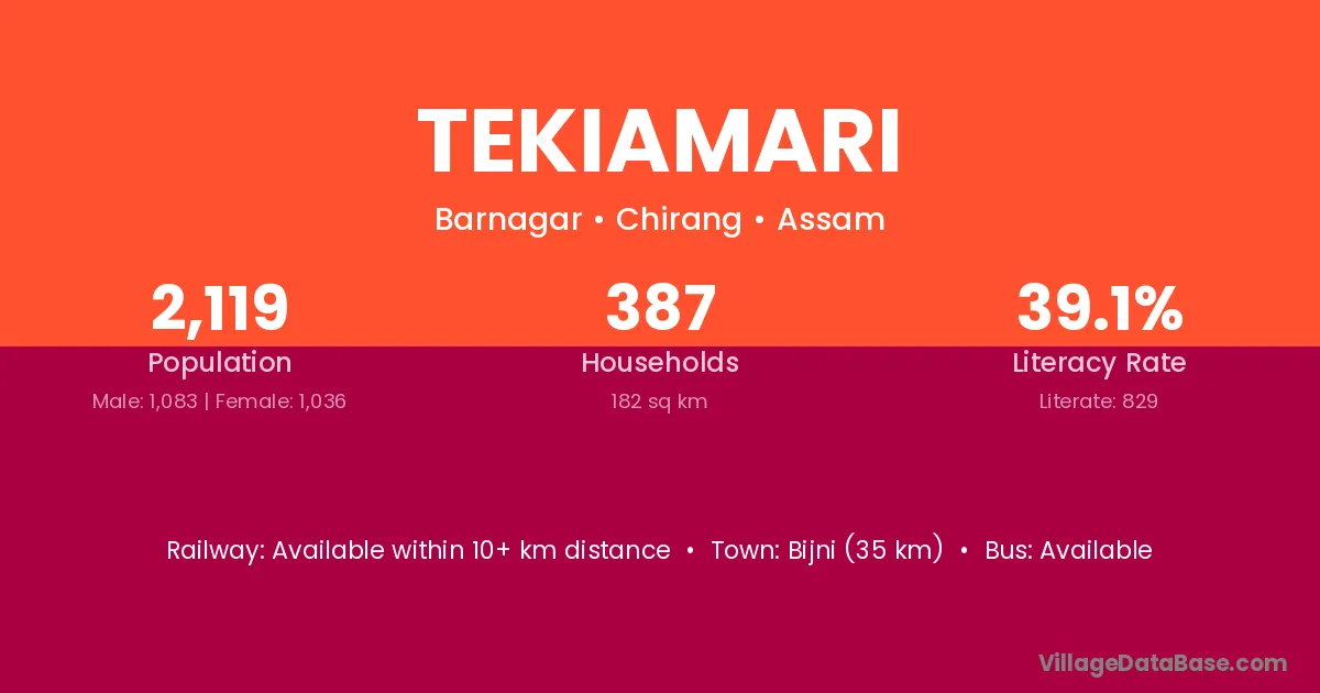 Bijni (35 km) is the nearest town to Tekiamari village for major economic activities and is located approximately 35 km away.