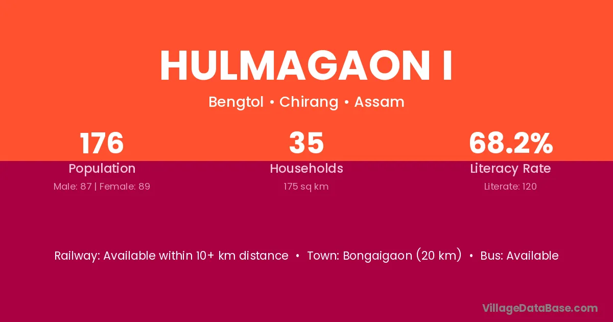 Bongaigaon (20 km) is the nearest town to Hulmagaon I village for major economic activities and is located approximately 20 km away.