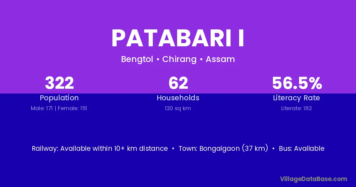 Bongaigaon (37 km) is the nearest town to Patabari I village for major economic activities and is located approximately 37 km away.