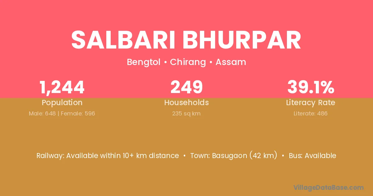 Salbari Bhurpar village has a total population of 1,244 people, of which 648 are males and 596 are females.