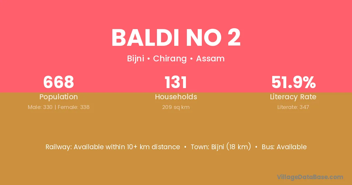 Bijni (18 km) is the nearest town to Baldi No 2 village for major economic activities and is located approximately 18 km away.