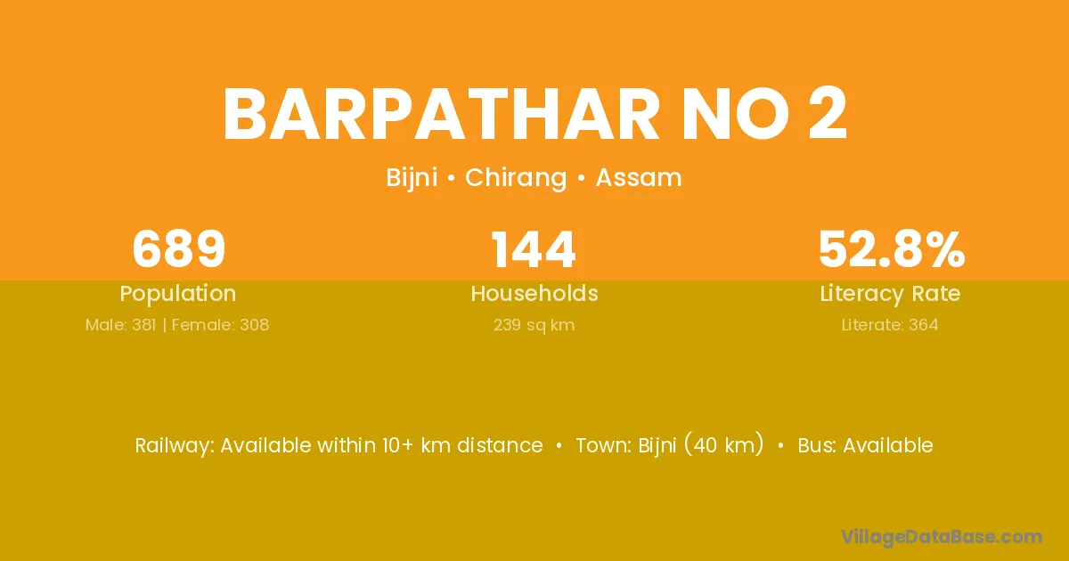 Barpathar No 2 village has a total population of 689 people, of which 381 are males and 308 are females.