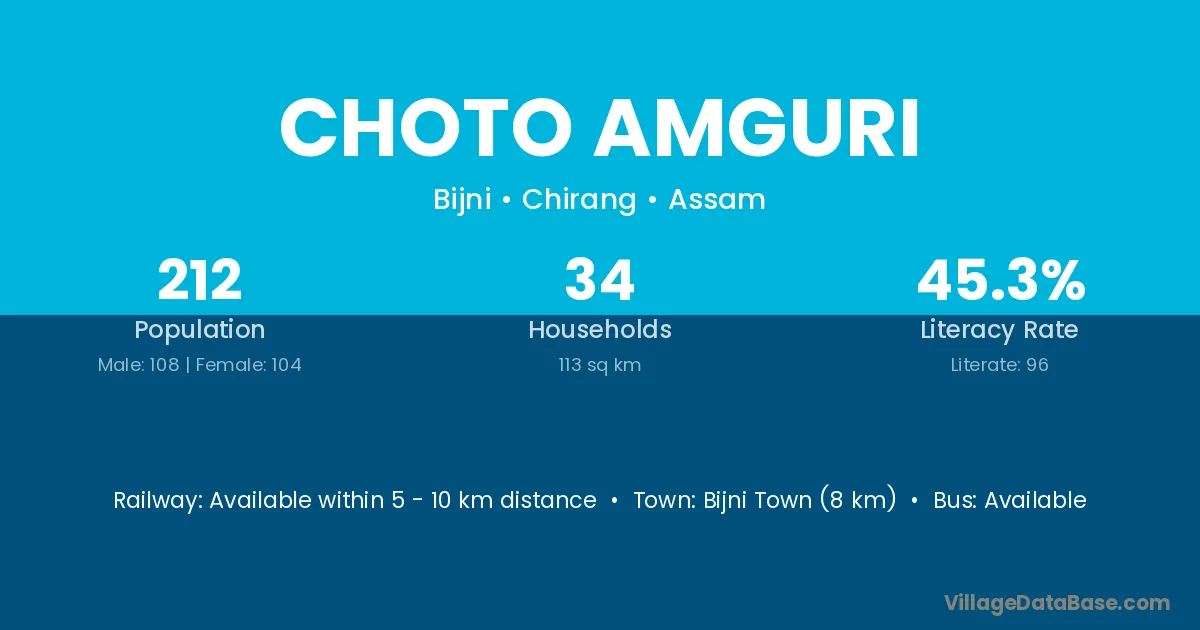 Choto Amguri village has a total population of 212 people, of which 108 are males and 104 are females.