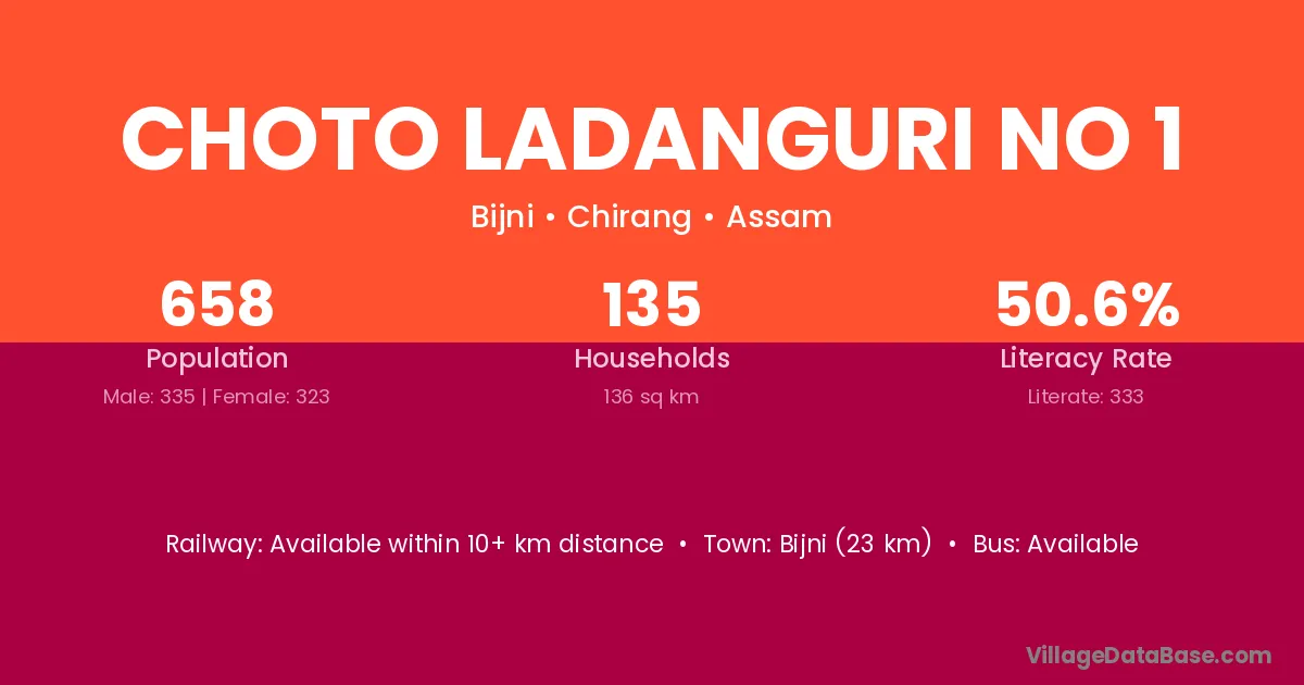 Choto Ladanguri No 1 village has a total population of 658 people, of which 335 are males and 323 are females.