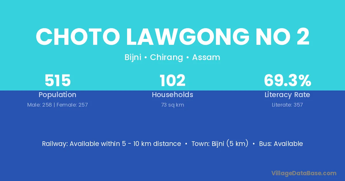 Choto Lawgong No 2 village has a total population of 515 people, of which 258 are males and 257 are females.