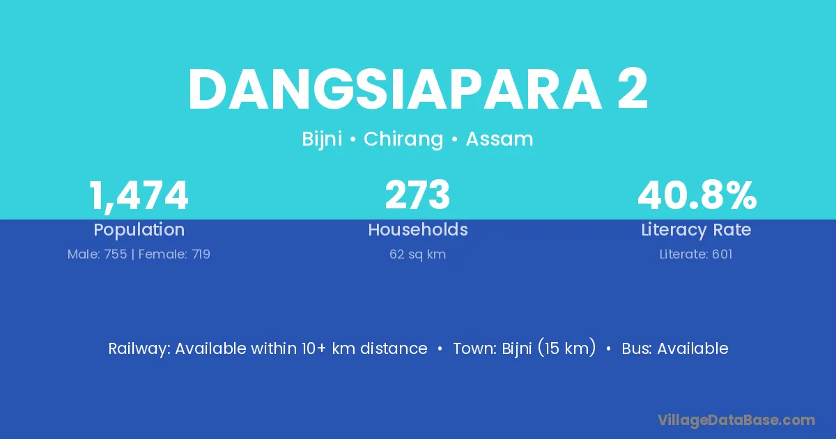 Bijni (15 km) is the nearest town to Dangsiapara 2 village for major economic activities and is located approximately 15 km away.