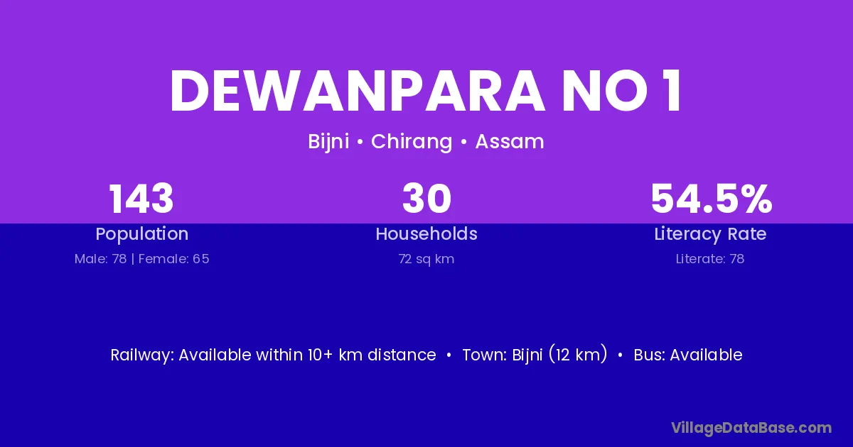 Dewanpara No 1 village has a total population of 143 people, of which 78 are males and 65 are females.