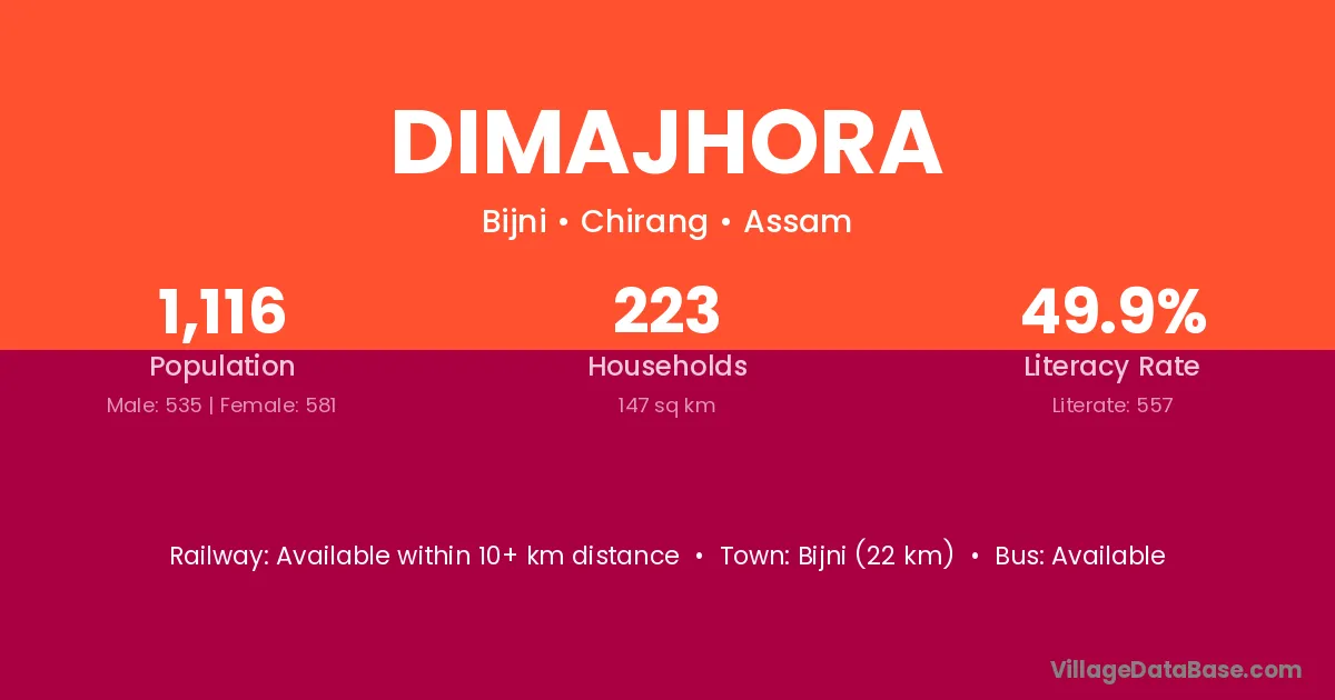 Bijni (22 km) is the nearest town to Dimajhora village for major economic activities and is located approximately 22 km away.