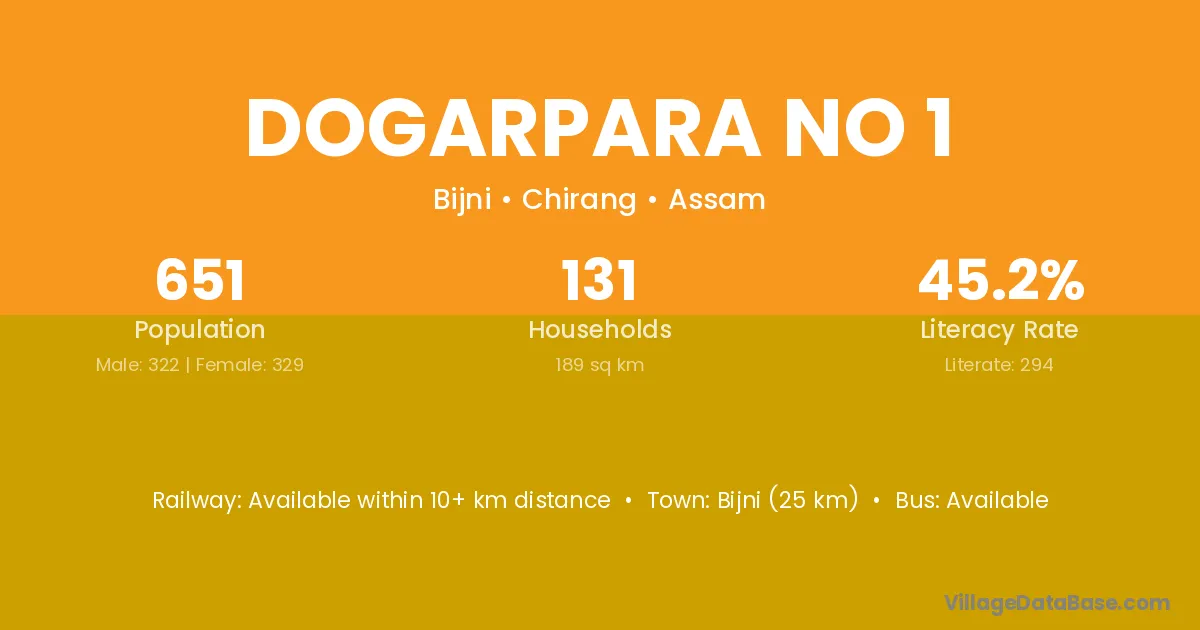 Dogarpara No 1 village has a total population of 651 people, of which 322 are males and 329 are females.