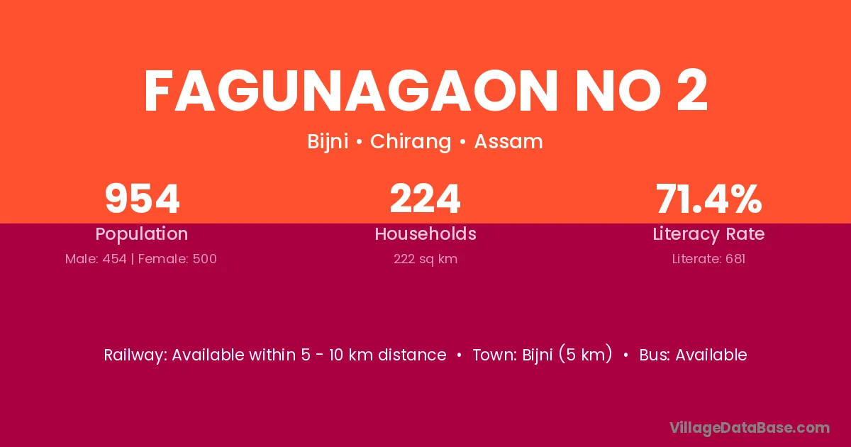 Bijni (5 km) is the nearest town to Fagunagaon No 2 village for major economic activities and is located approximately 5 km away.