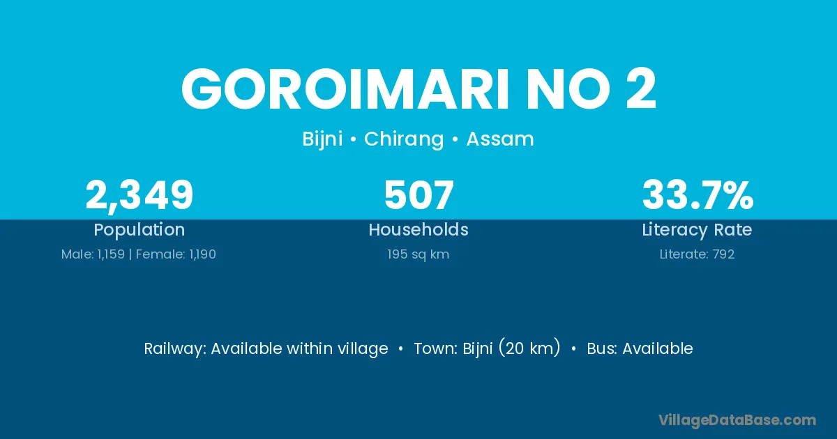 Bijni (20 km) is the nearest town to Goroimari No 2 village for major economic activities and is located approximately 20 km away.