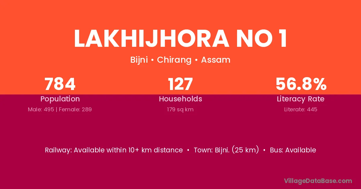 Lakhijhora No 1 village has a total population of 784 people, of which 495 are males and 289 are females.