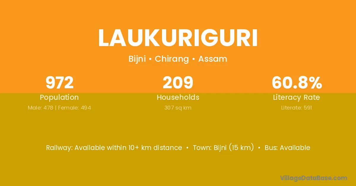 Bijni (15 km) is the nearest town to Laukuriguri village for major economic activities and is located approximately 15 km away.