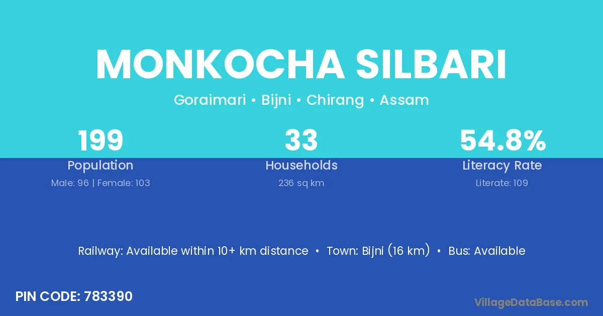 Bijni (16 km) is the nearest town to Monkocha Silbari village for major economic activities and is located approximately 16 km away.