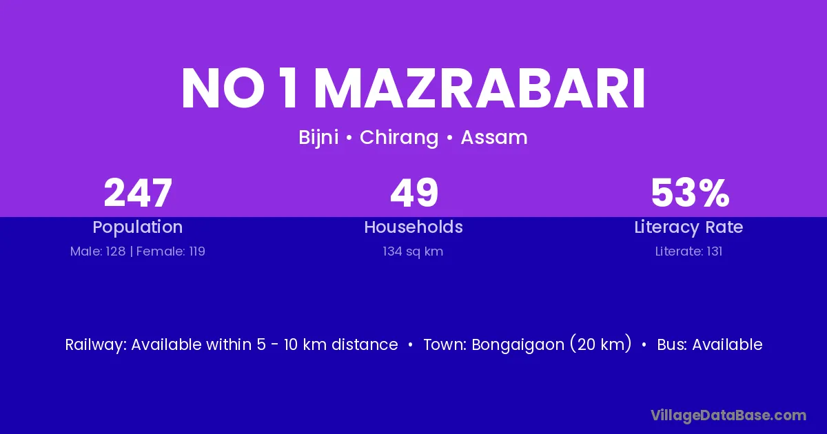 Bongaigaon (20 km) is the nearest town to No 1 Mazrabari village for major economic activities and is located approximately 20 km away.