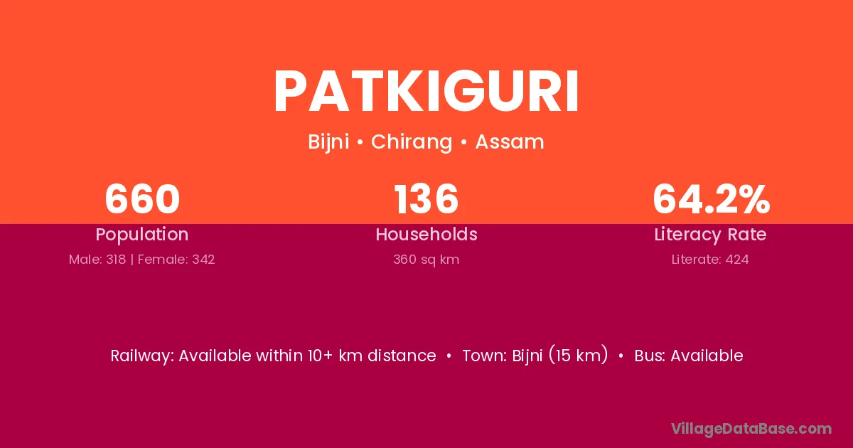 Patkiguri village has a total population of 660 people, of which 318 are males and 342 are females.