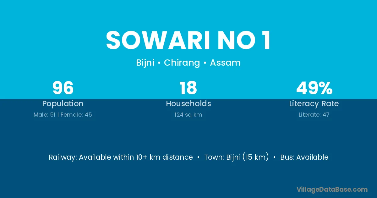 Bijni (15 km) is the nearest town to Sowari No 1 village for major economic activities and is located approximately 15 km away.