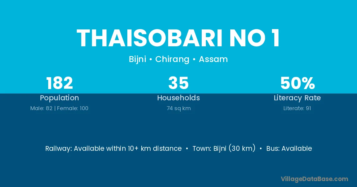 Bijni (30 km) is the nearest town to Thaisobari No 1 village for major economic activities and is located approximately 30 km away.