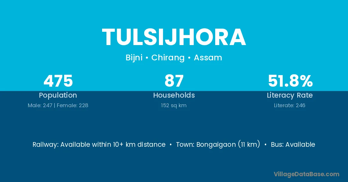 Bongaigaon (11 km) is the nearest town to Tulsijhora village for major economic activities and is located approximately 11 km away.