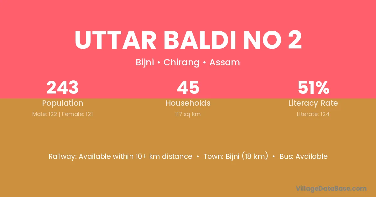 Bijni (18 km) is the nearest town to Uttar Baldi No 2 village for major economic activities and is located approximately 18 km away.