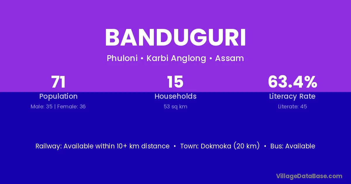 Bongaigaon (12 km) is the nearest town to Banduguri village for major economic activities and is located approximately 12 km away.