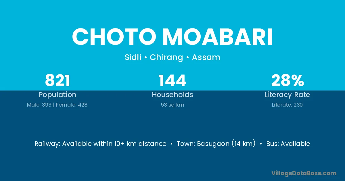 Choto Moabari village has a total population of 821 people, of which 393 are males and 428 are females.