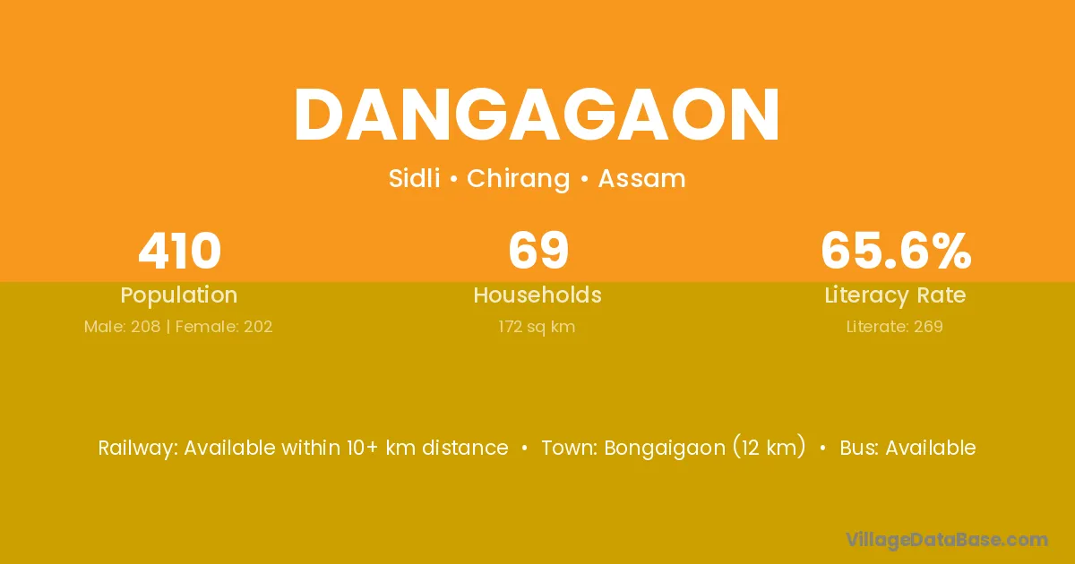 Bongaigaon (12 km) is the nearest town to Dangagaon village for major economic activities and is located approximately 12 km away.