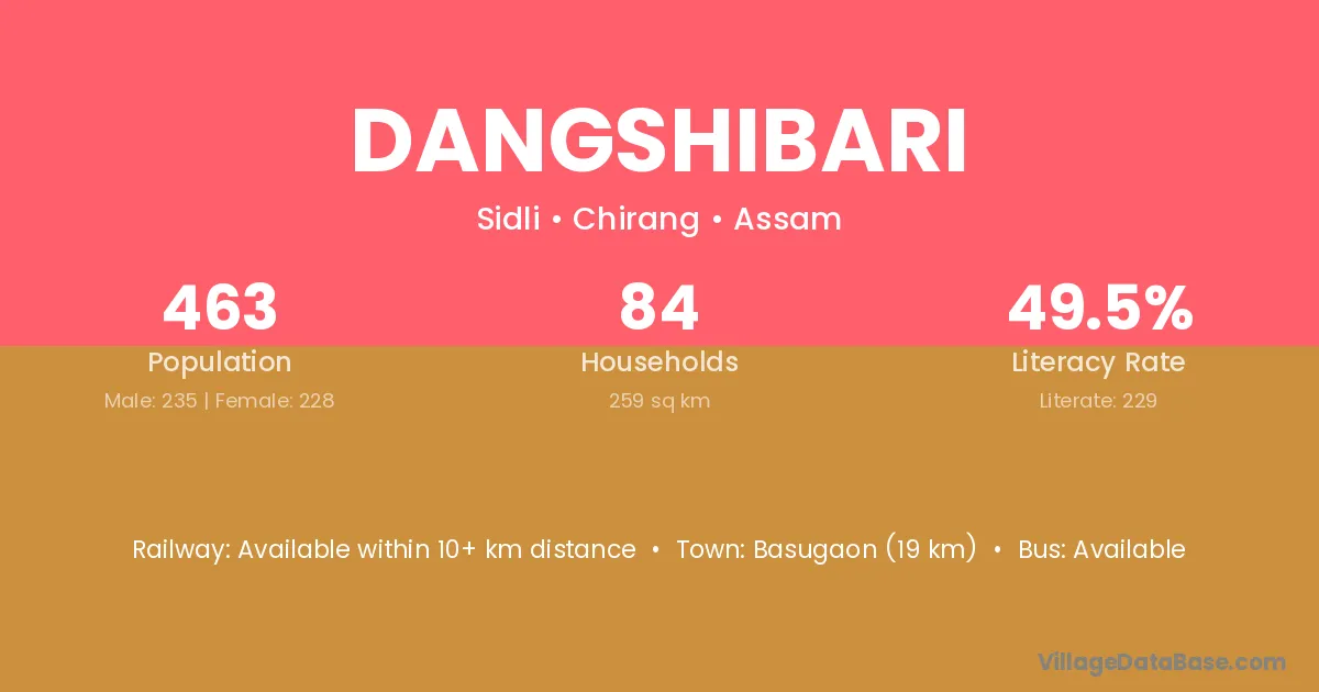 Dangshibari village has a total population of 463 people, of which 235 are males and 228 are females.