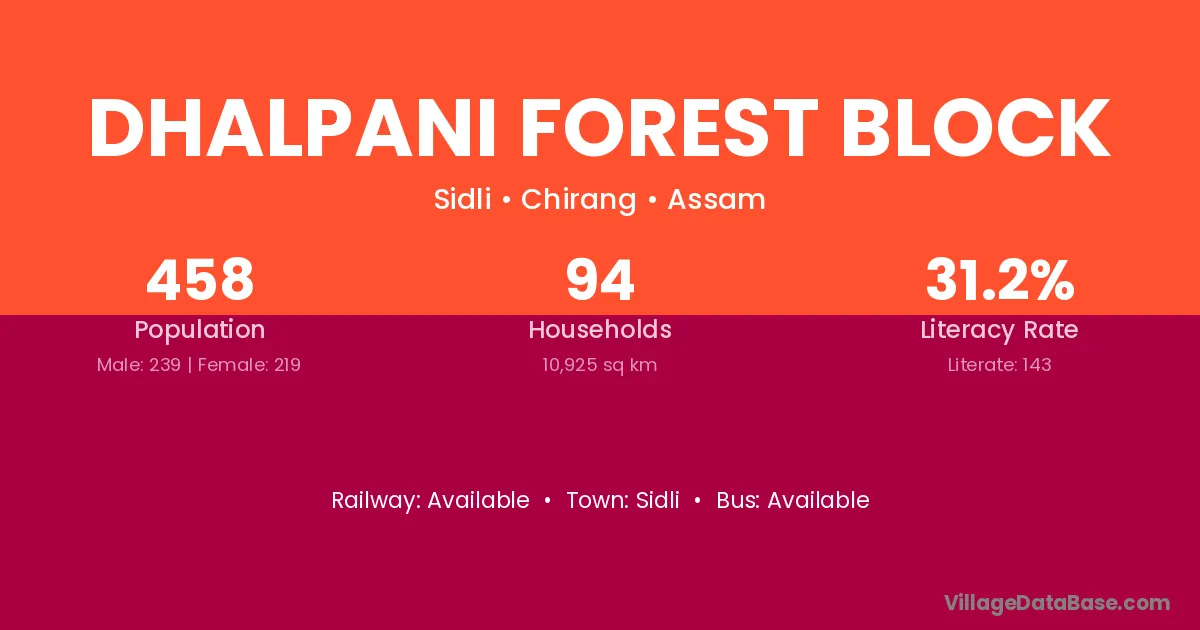 Dhalpani Forest Block village has a total population of 458 people, of which 239 are males and 219 are females.