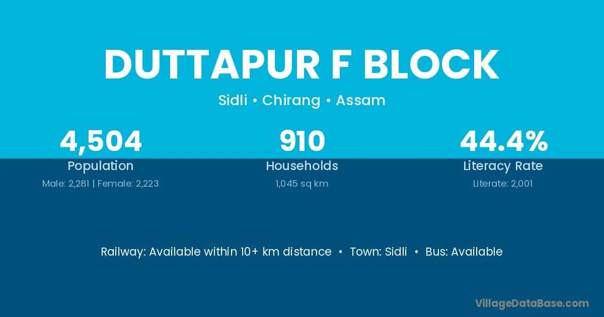 Duttapur F Block village has a total population of 4,504 people, of which 2,281 are males and 2,223 are females.