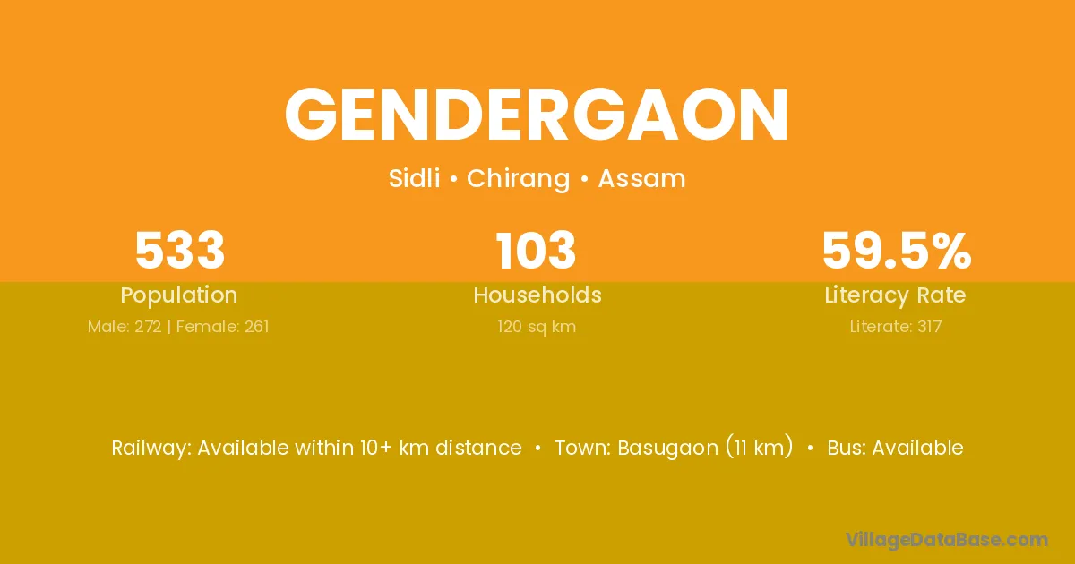 Basugaon (11 km) is the nearest town to Gendergaon village for major economic activities and is located approximately 11 km away.
