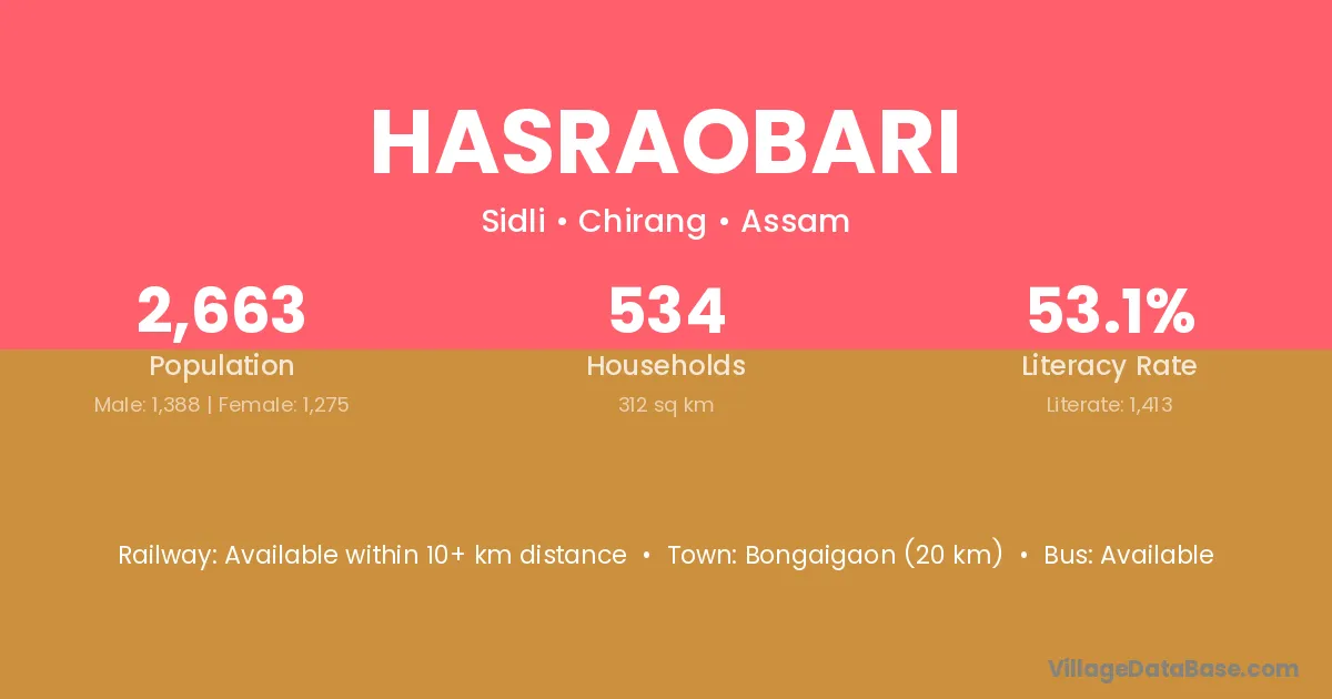 Bongaigaon (20 km) is the nearest town to Hasraobari village for major economic activities and is located approximately 20 km away.