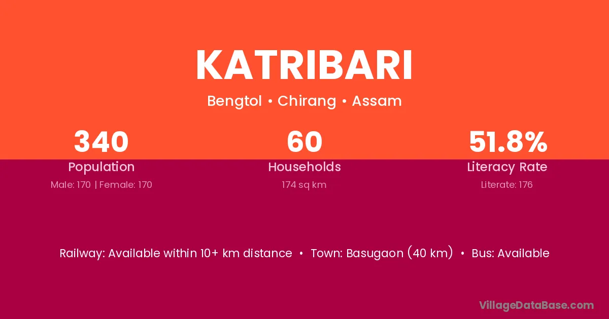 Bongaigaon (12 km) is the nearest town to Katribari village for major economic activities and is located approximately 12 km away.