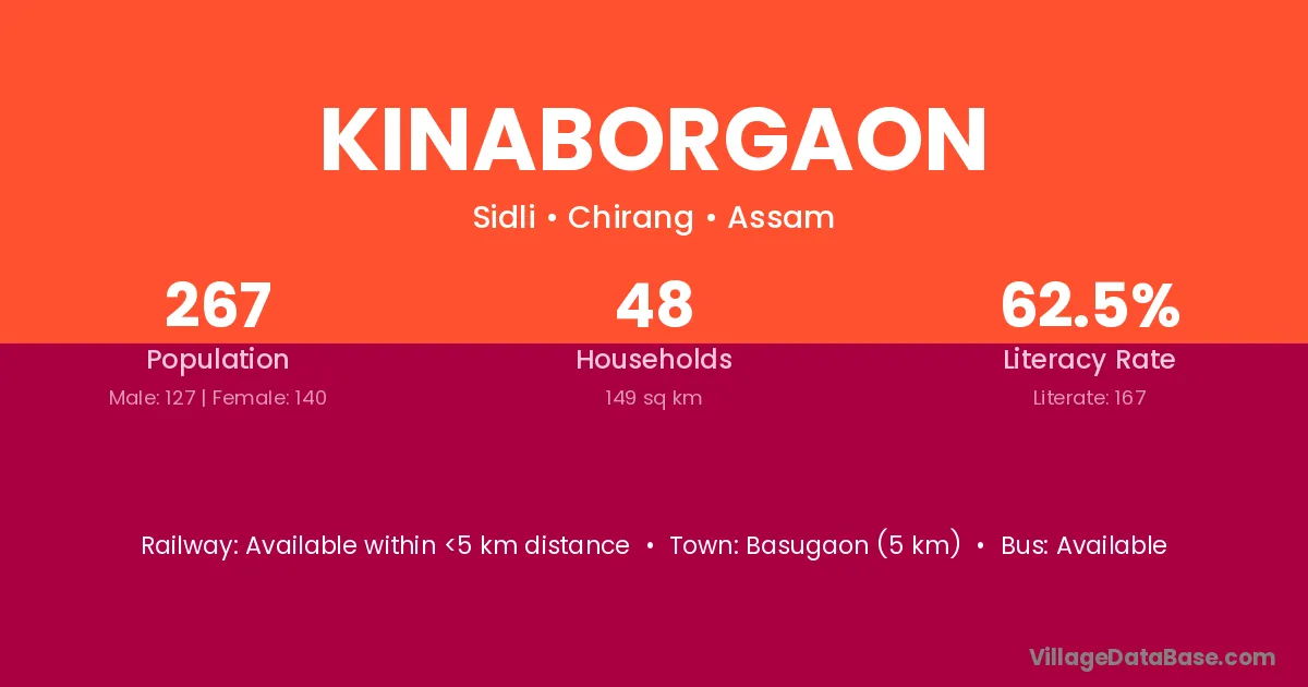 Kinaborgaon village has a total population of 267 people, of which 127 are males and 140 are females.