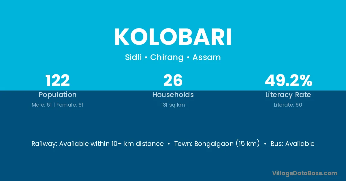 Bongaigaon (15 km) is the nearest town to Kolobari village for major economic activities and is located approximately 15 km away.