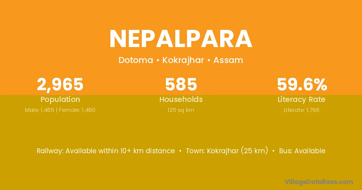 Bongaigaon (15 km) is the nearest town to Nepalpara village for major economic activities and is located approximately 15 km away.